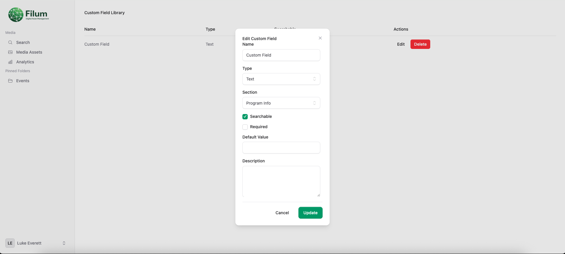 Define your own fields—text, select, multi-select, and more—organise them in sections, and search and filter by them on media.
